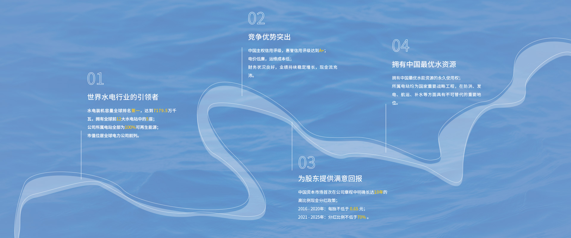 長江電力主要從事水力發電、投融資、抽水蓄能、智慧綜合能源、新能源和配售電等業務,經營區域覆蓋中國、秘魯、巴西、巴基斯坦等多個國家,是中國最大的電力上市公司和全球最大的水電上市公司。長江電力運營管理的烏東德、白鶴灘、溪洛渡、向家壩、三峽、葛洲壩六座梯級電站,構成了世界最大清潔能源走廊,有效保障了長江流域防洪、航運、補水和生態安全,為我國經濟社會綠色發展提供了強勁動能。